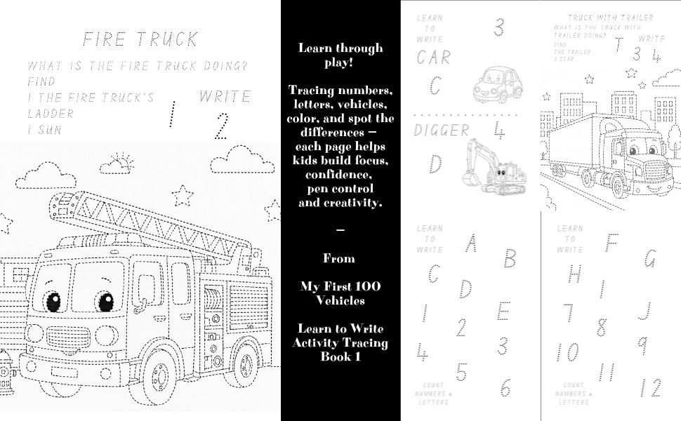 Through playful tracing, counting, and observation games, children naturally develop early writing skills, number recognition, focus, and fine motor control — all while exploring the exciting world of vehicles.