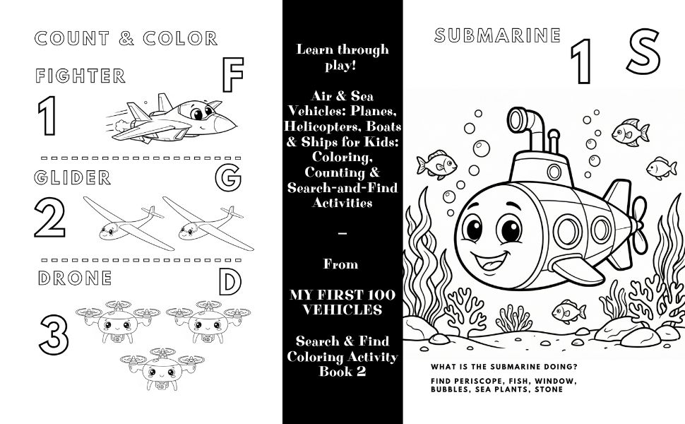 ✈️🚢 Air & Sea Vehicles: Planes, Helicopters, Boats & Ships for Kids: Coloring, Counting & Search-and-Find Activities
